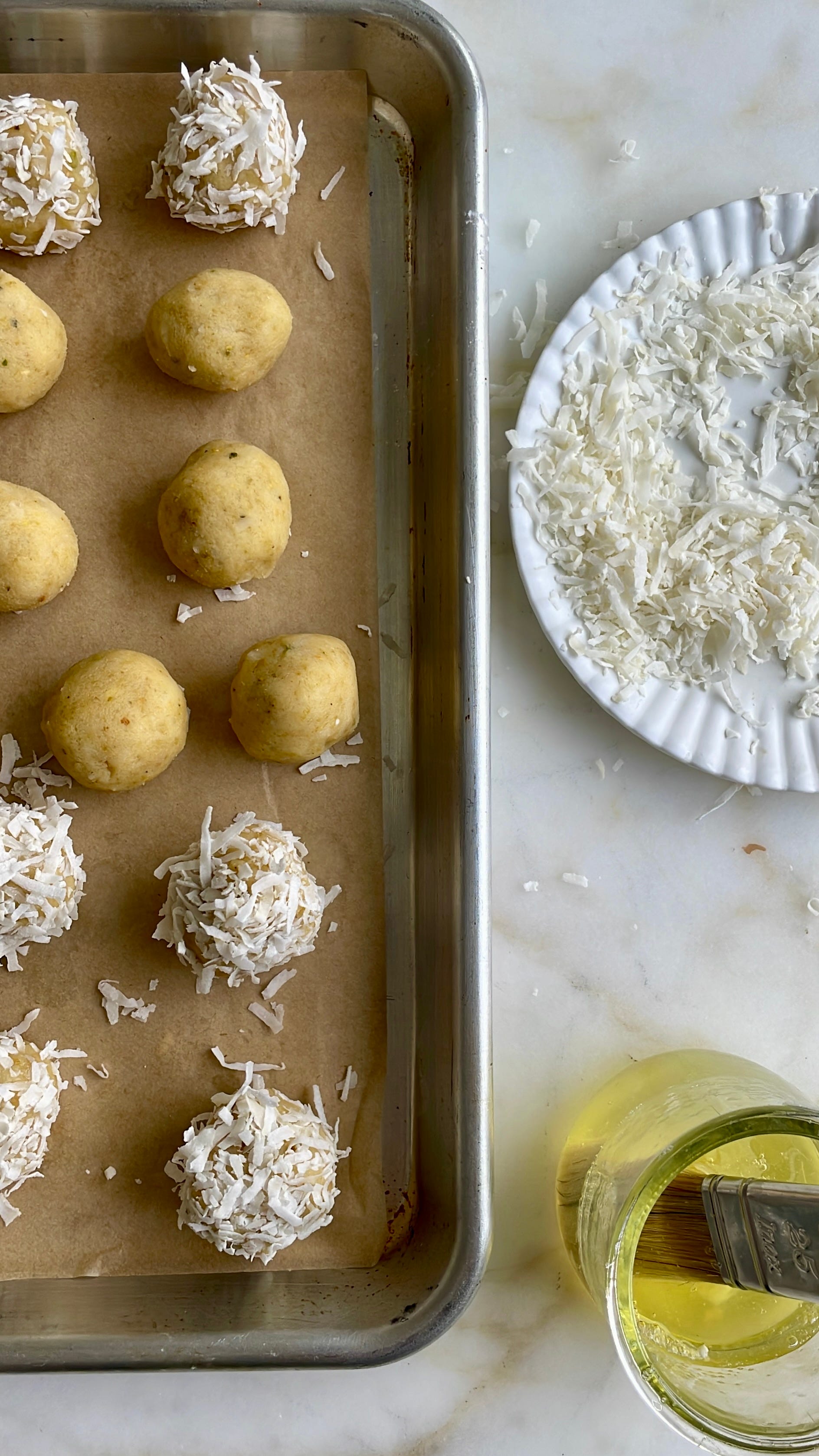 I know it seems fussy to call for two different kinds of coconut, but there’s a reason for this: The cookies are better with sweetened, soft coconut (like Angel Flake) in the dough, but long-shredded (not ground) unsweetened coconut looks cuter and spikier on the exterior, and the added crunch is nice too. That said, if you only use one, use the sweetened kind. It’s fine on the outside. It doesn’t stick quite as well, but it works!